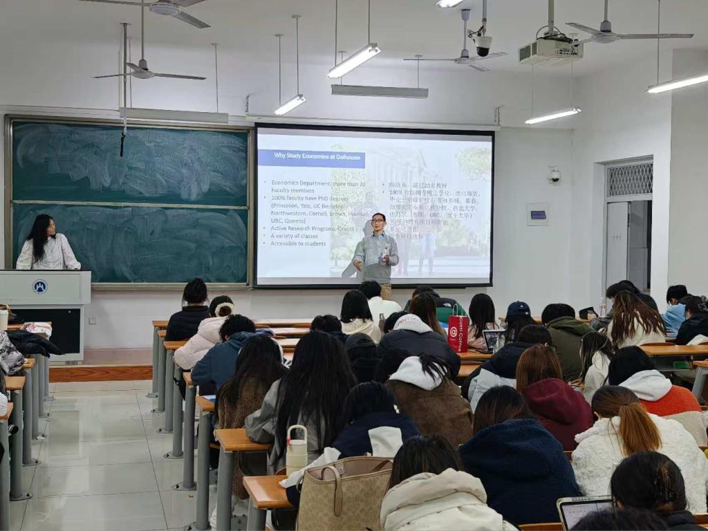 座谈结束后,Norovsambuu主任一行前往圣井校区,为经济学专业大二学生举办了题为“跨越大洋,数析未来”的中加合作项目分享会。会上,Norovsambuu主任详细介绍了达尔豪斯大学的学习环境、课程体系及未来发展前景,并就学生关心的留学申请、学分转换、就业方向等问题进行了耐心解答,激发了同学们的学习热情。